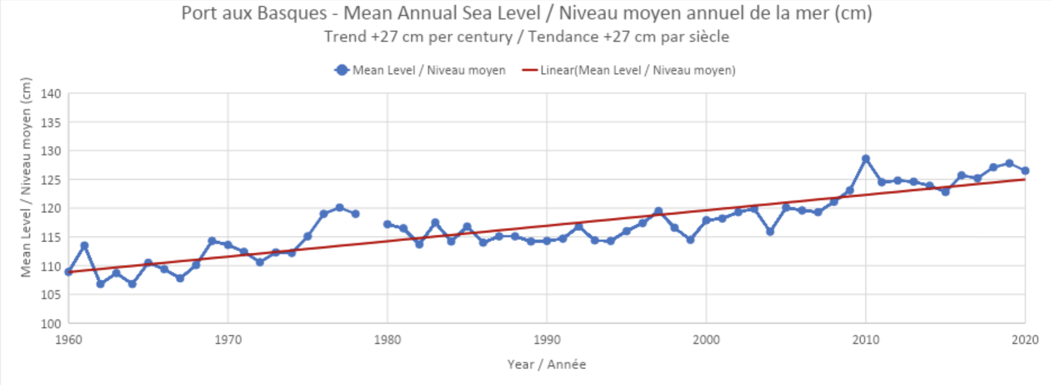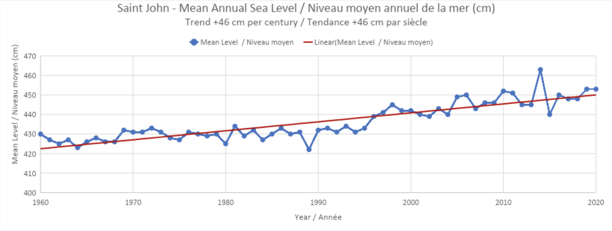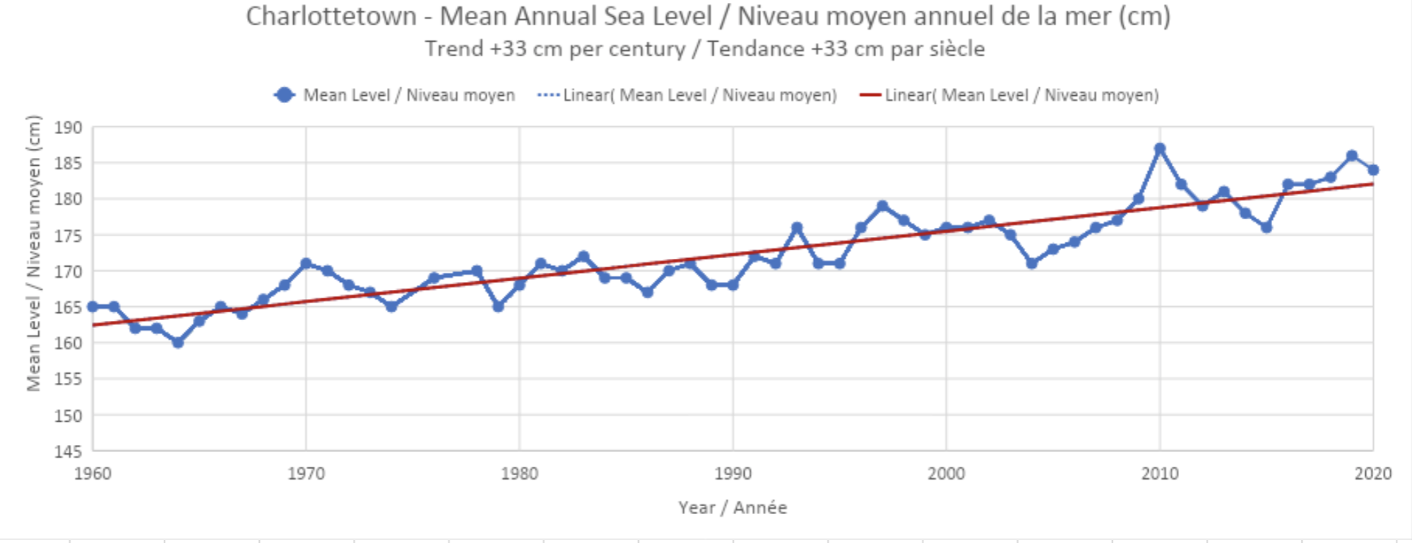 Figure Notes: Mean Sea Level data represented in these graphs is measured relative to Chart Datum (CD), the plane of vertical reference to which all charted depths on navigation charts are related and is selected so that the water level will seldom fall below it. Predicted Tide Tables are referenced to CD. Mean annual sea level data points were calculated as annual means from daily mean water levels downloaded from the Marine Environmental Data Section of Fisheries and Oceans Canada: https://www.meds-sdmm.dfo-mpo.gc.ca/isdm-gdsi/twl-mne/inventory-inventaire/index-eng.htm.
