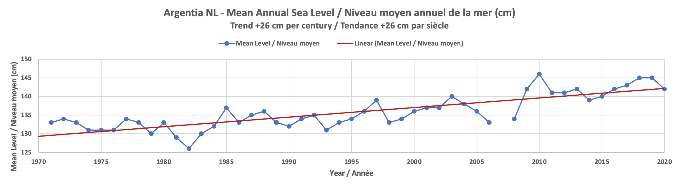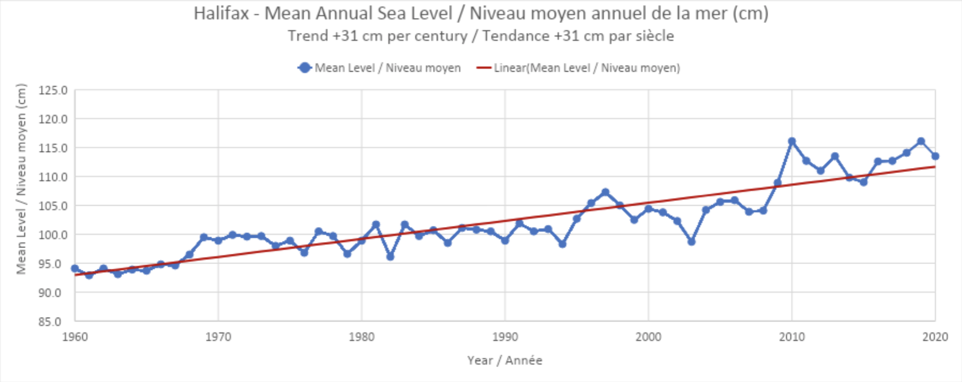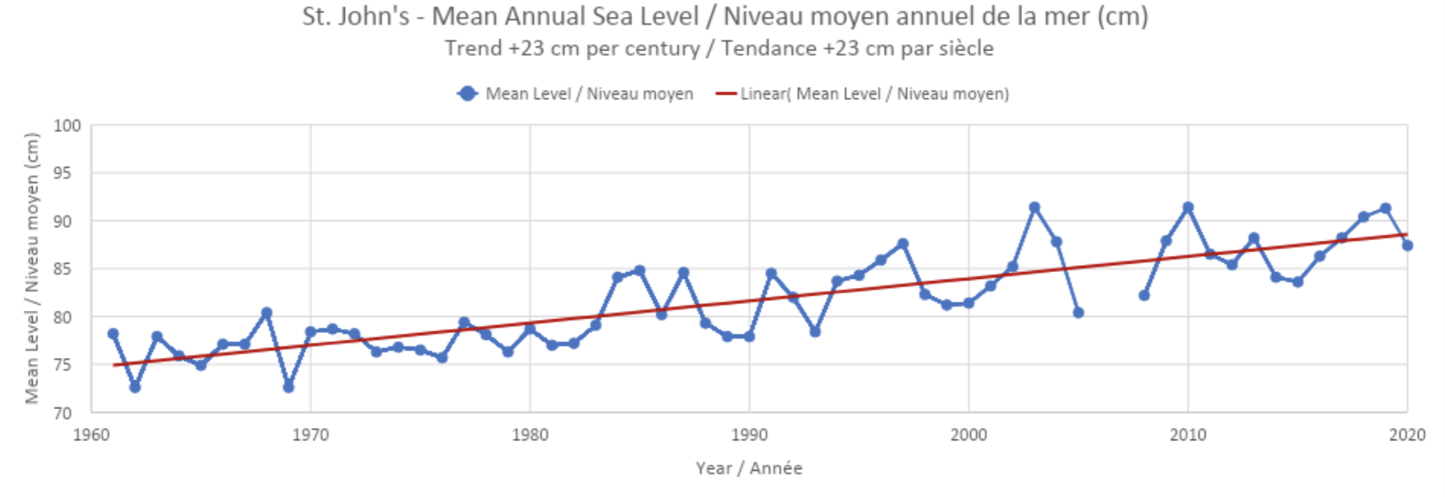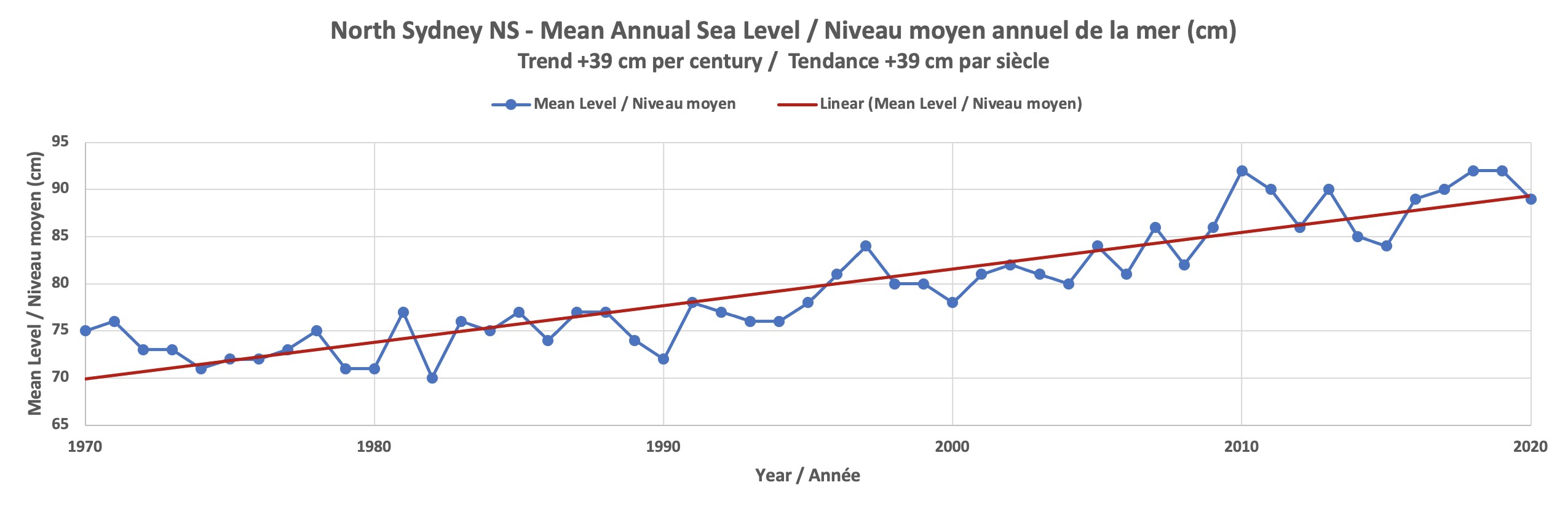 Figure Notes: Mean Sea Level data represented in these graphs is measured relative to Chart Datum (CD), the plane of vertical reference to which all charted depths on navigation charts are related and is selected so that the water level will seldom fall below it. Predicted Tide Tables are referenced to CD. Mean annual sea level data points were calculated as annual means from daily mean water levels downloaded from the Marine Environmental Data Section of Fisheries and Oceans Canada: https://www.meds-sdmm.dfo-mpo.gc.ca/isdm-gdsi/twl-mne/inventory-inventaire/index-eng.htm.